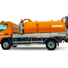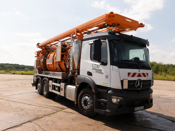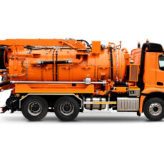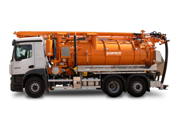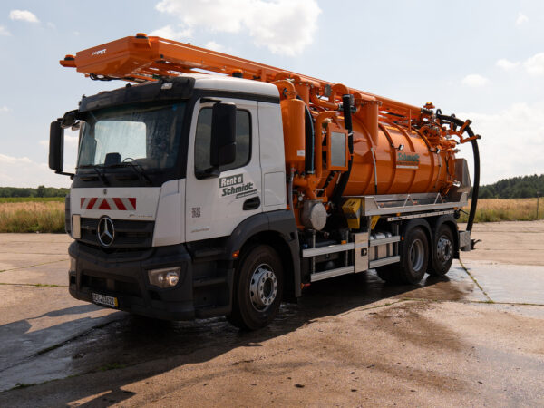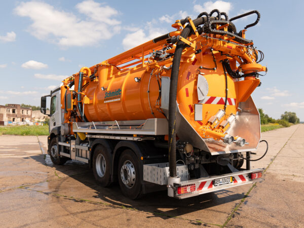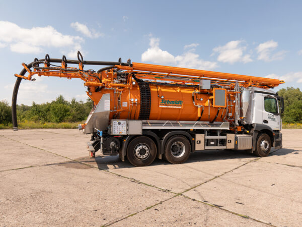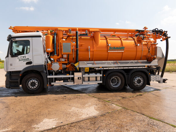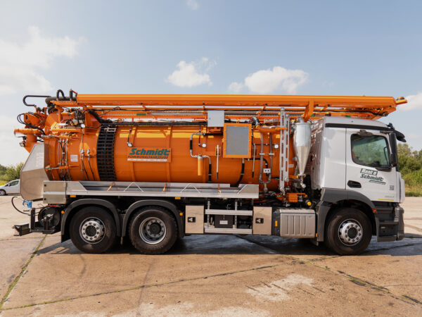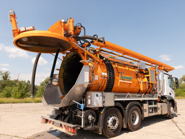 Eine Hochdruckpumpe mit einer Förderleistung von 70 l/min 130 bar ermöglicht die gleichzeitige Reinigung des Abwassersystems mit einer Hochdruck-Schlauchtrommel mit einem 60 m langen DN13-Schlauch, während das Abwasser durch die „Kassette“ abgesaugt wird.