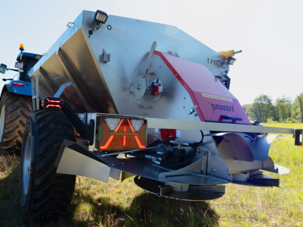 - Streubreiteneinstellung über ein hydraulisch-mechanisches Ventil, das den Ölfluss zu den Hydraulikmotoren für den Antrieb der Streuteller steuert, oder von der Schlepperkabine aus mit einer Funktion LOW SENCE